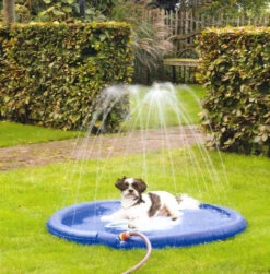 De sprinkler mat bevat aan de rand verschillende sprinklers. Door de mat aan te sluiten op een waterslang, met het bijgeleverde koppelstuk, wordt er uit deze gaatjes water gesproeid. Het enige wat jouw hond hoeft te doen is, lekker te gaan liggen op de mat en te genieten van de waterstralen.