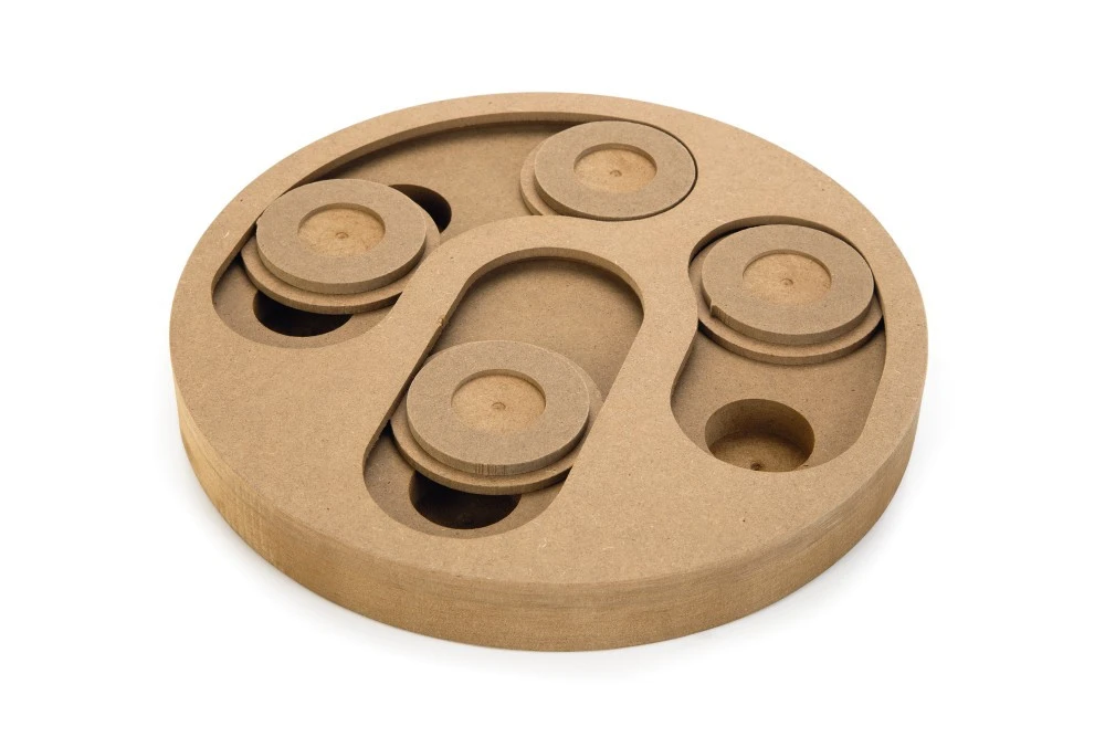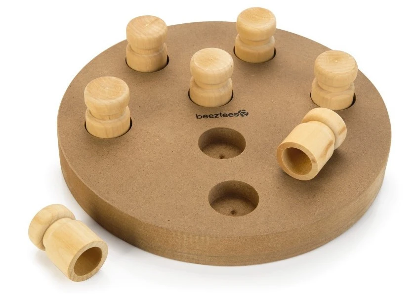 Door iets lekkers in het spel te verstoppen, zal jouw hond worden uitgedaagd om dit te zoeken. Giono is aan twee kanten te gebruiken, waardoor je iedere keer een ander spelletje kan spelen met jouw hond. Aan de ene kant moet jouw hond de schuiven opzij schuiven met zijn snuit of poten om bij een beloning te komen. Aan de andere kant moet jouw hond proberen de houten doppen te verwijderen. Door de beloning regelmatig op een andere plek in het spel te verstoppen, blijft het een leuke uitdaging voor jouw hond.