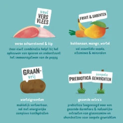 • Verse scharreleend zit vol met proteïnen om de spieren van puppy’s te versterken