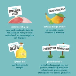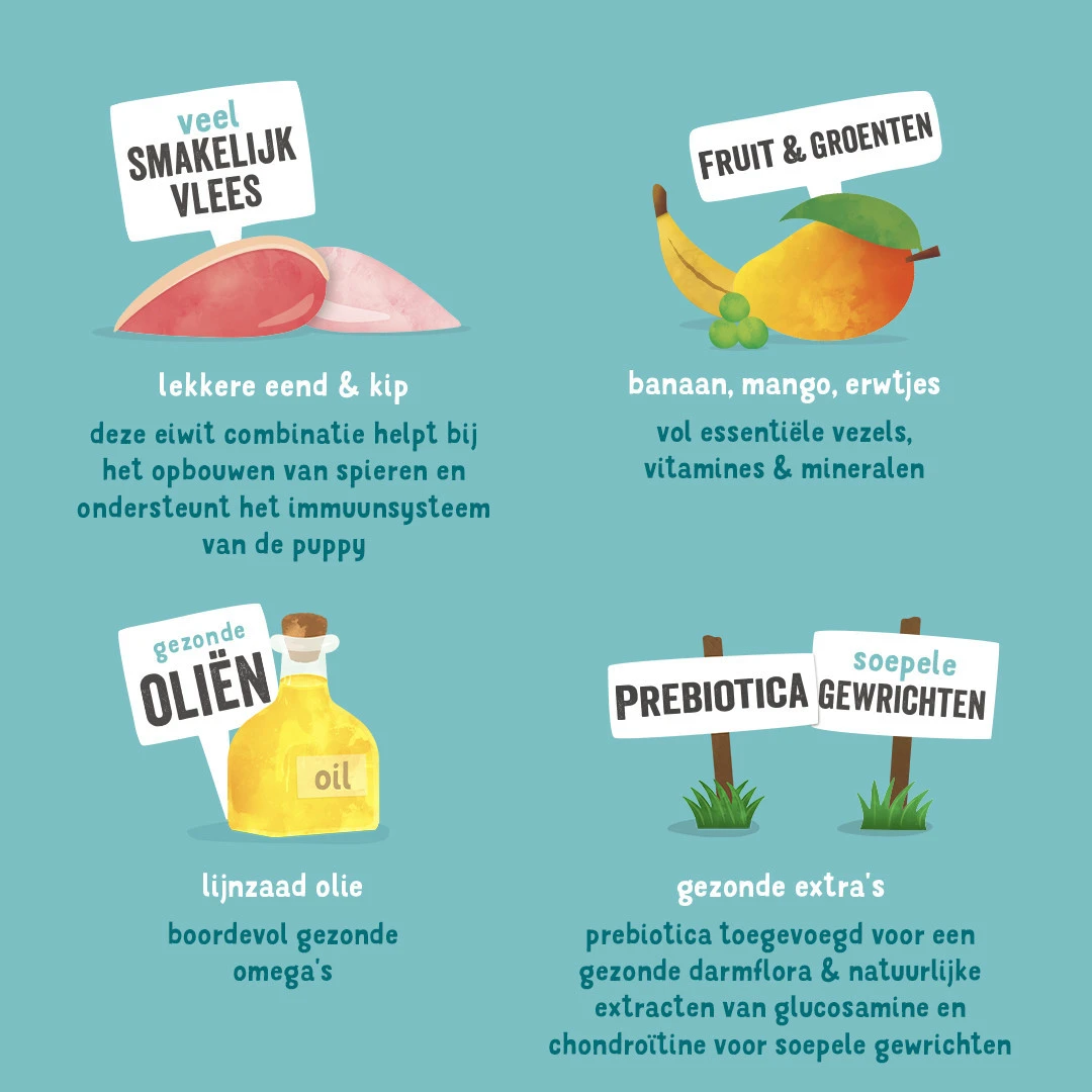 Edgard & Cooper hondenvoer Puppy eend en kip is gemaakt met een graanvrij recept en zit boordevol lekkere eend en kip, speciaal voor opgroeiende pups. De voeding is rijk aan sappige eiwitten die spieren helpen opbouwen en gezonde lichaamsfuncties ondersteunen. Het recept bevat prebiotica voor een gezonde darmflora.