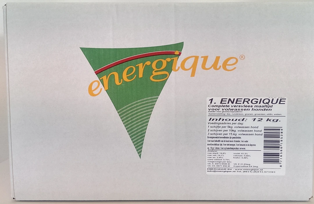 Energique Volwassen hond 1 is een complete vers vleesmaaltijd en kan vanaf de leeftijd van ongeveer 10 maanden voor kleine en middelgrote rassen en 12 maanden voor grote rassen gevoerd worden.