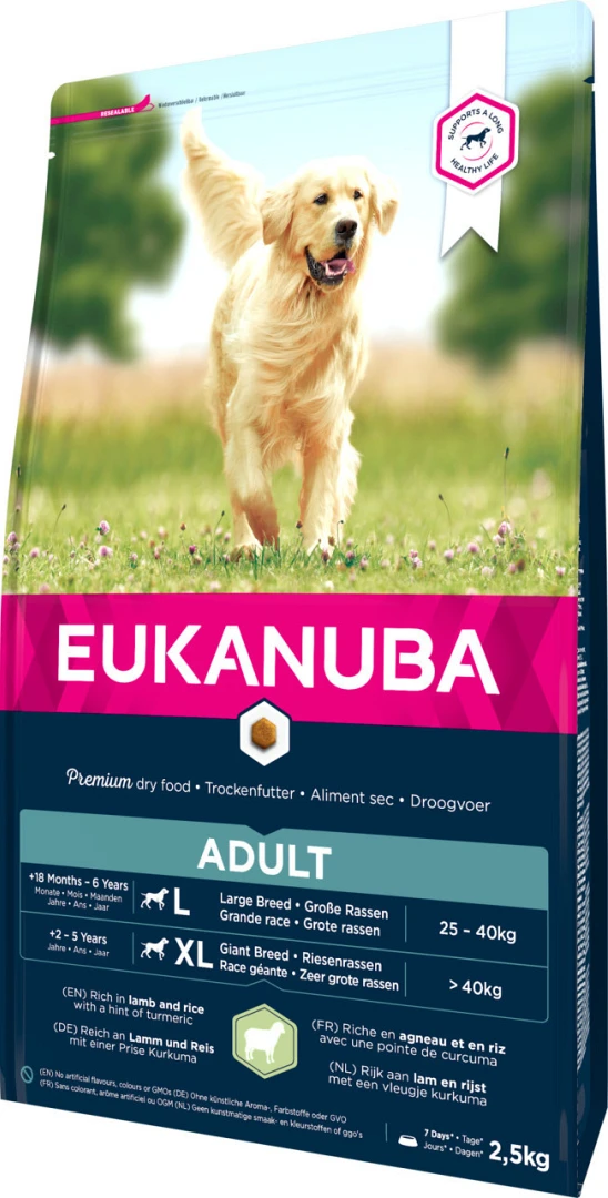 Eukanuba Large Breed adult lamb & rice is een complete en uitgebalanceerde voeding bestaande uit lamsvlees wat de voeding licht verteerbaar maakt en welke zelfs geschikt is voor gevoelige honden.