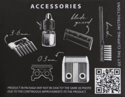 Inclusief: opzetkam 3 – 6 mm, schoonmaakborstel, schaar, olie en mesbescherming.