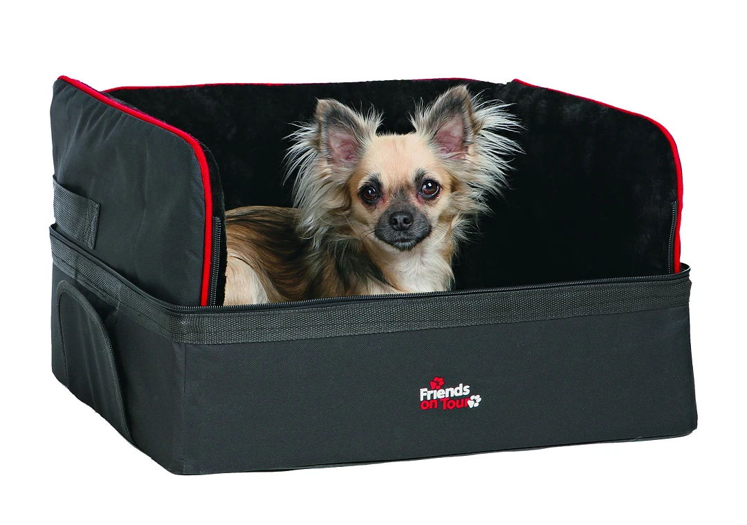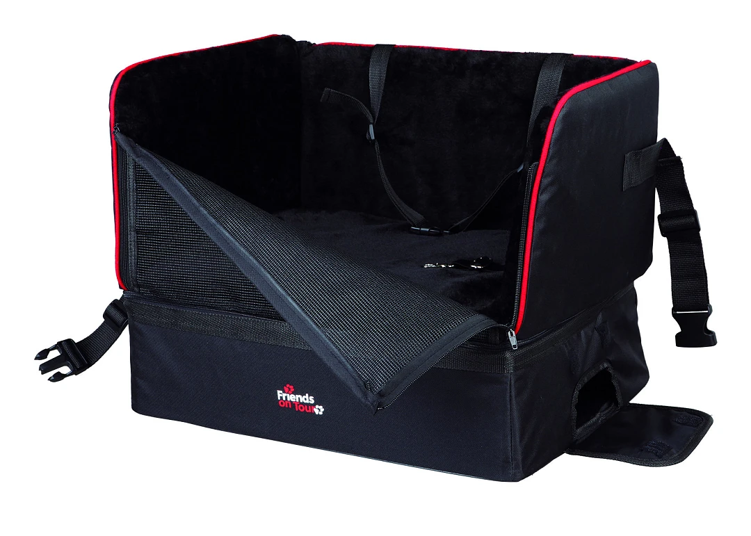 Veilige autostoel voor kleine honden. Zeer comfortabel dankzij de pluchen binnenzijde. Met geïntegreerde riem en uitsparing voor autogordel.